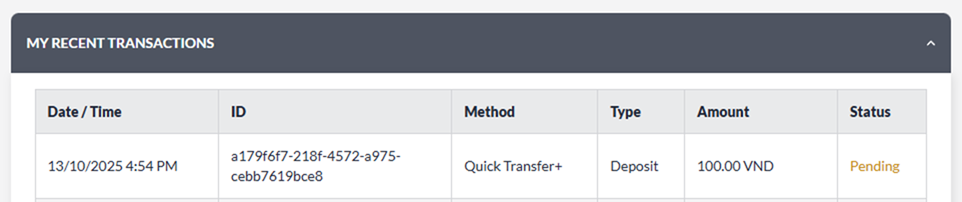 - Your transaction status will be display on MY RECENT TRANSACTIONS